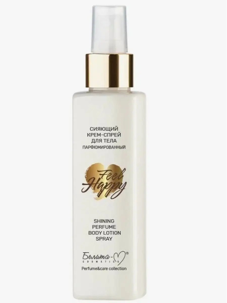 Белита-М FEEL HAPPY Сияющий КРЕМ-СПРЕЙ для тела парфюмированный, 150г. Эффект 3-в-1: соблазнительный аромат, утонченное сияние и совершенная кожа. Крем-спрей быстро впитывается, не оставляя липкости. Мельчайший золотистый шиммер покрывает кожу легкой сияющей вуалью, оптически выравнивая поверхность и придавая ухоженный вид. Искрящийся аромат, сочетающий нежные цветочные ноты с аккордами весенней свежести и шармом вечернего Парижа, подчеркивает Вашу индивидуальность и женственность. Активные компоненты: экстракт цветов гардении экстракт цветов гибискуса пантенол бетаин. Действие: - придает увлажненность и мягкость - окутывает соблазнительным ароматом на длительное время - оптически выравнивая рельеф кожи, скрывая мелкие несовершенства.