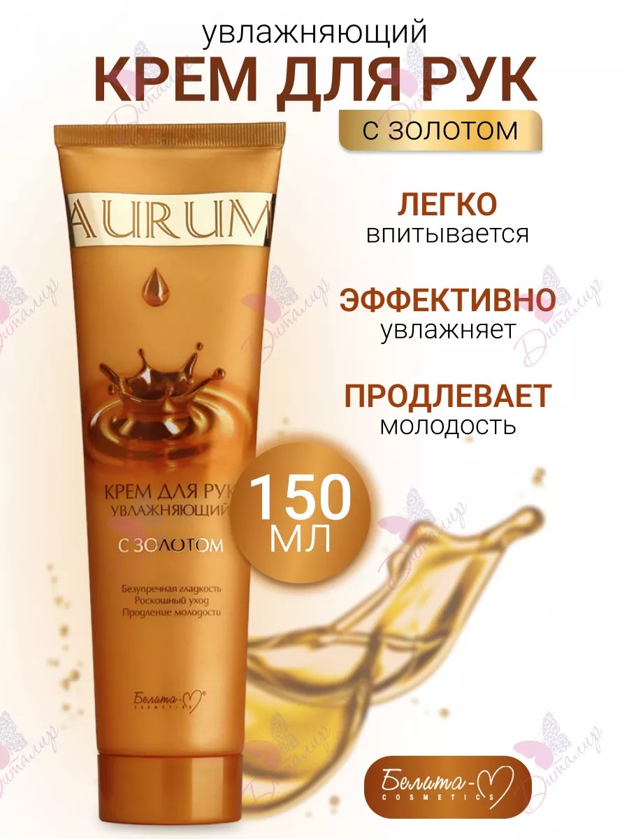 Крем для рук с золотом Aurum. Нежирный, идеально сбалансированный крем легко впитывается, обеспечивая коже рук роскошный уход. Активные компоненты крема эффективно увлажняют, восстанавливают естественный гидробаланс кожи. Активные ингредиенты: низкомолекулярная, гиалуроновая кислота, коллоидное золото, масла карите и кокоса, экстракты цветков апельсина и белого чая, бисаболол. Активное действие: насыщает клетки влагой, обеспечивает роскошный уход и безупречную гладкость, оказывает противовоспалительное действие. Способ применения: нанести на руки легкими массажными движениями.