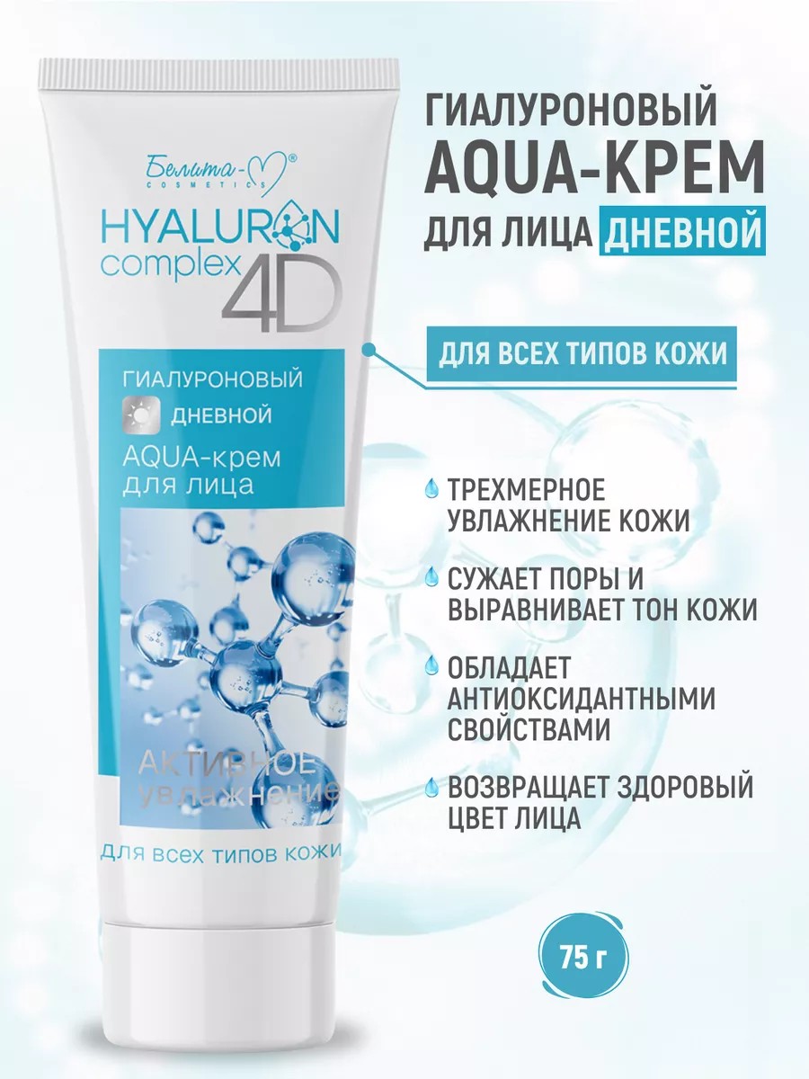 Гиалуроновый дневной AQUA-крем для лица HYALURON complex 4D Белита-М создает мощную трехмерную систему удержания влаги, обеспечивает глубокое увлажнение кожи, стимулирует синтез собственного коллагена, обладает себобалансирующим действием, сужает поры