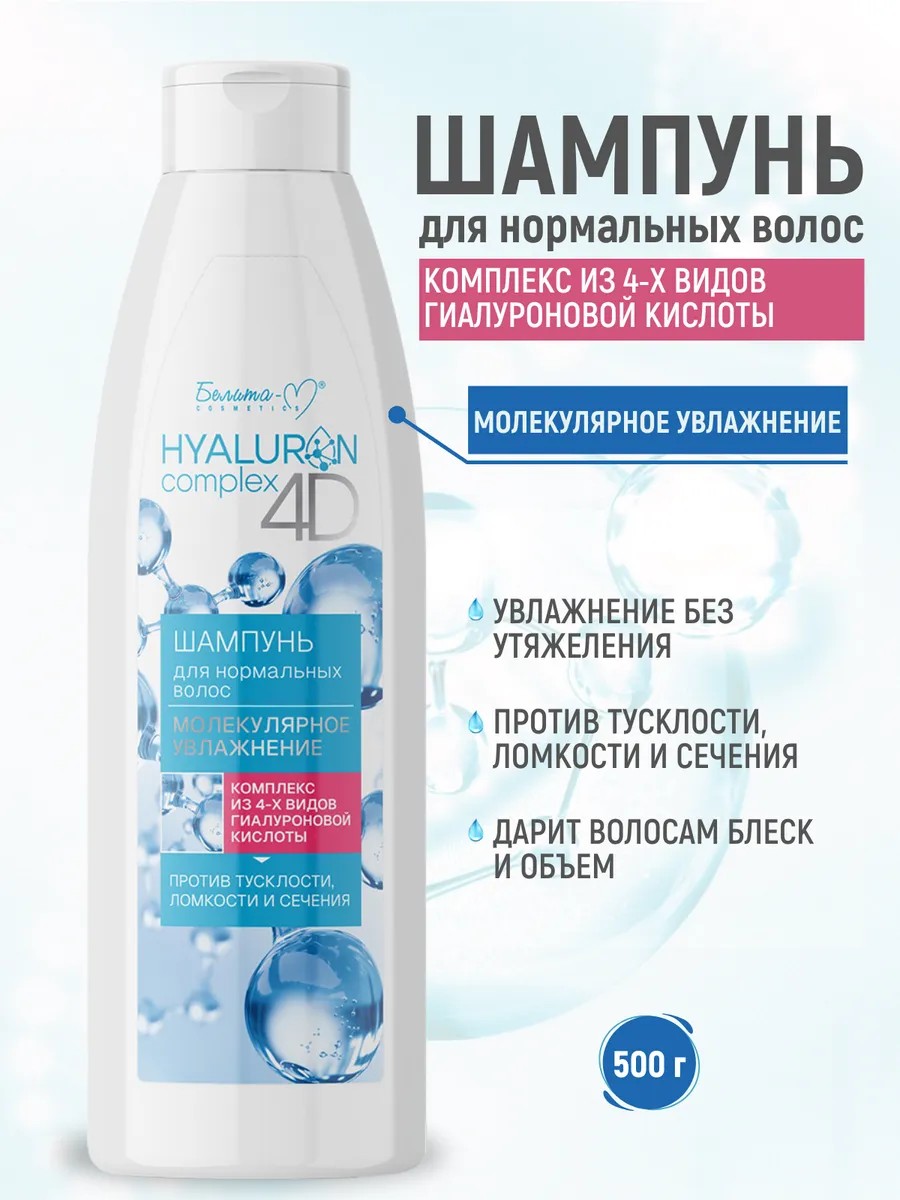 Шампунь для нормальных волос МОЛЕКУЛЯРНОЕ УВЛАЖНЕНИЕ HYALURON complex 4D 500 мл Belita- М создает трехмерную систему удержания влаги, формируя невесомый экран, восстанавливает защитные свойства кутикулы волоса, обеспечивает глубокое увлажнение, дарит волосам блеск и объем