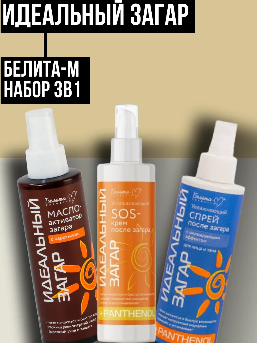 Набор «Идеальный загар 3 в 1» — отличный комплект для тех, кто заботится о здоровье и красоте кожи во время загара. В него входят три важнейших средства Белорусского производства: