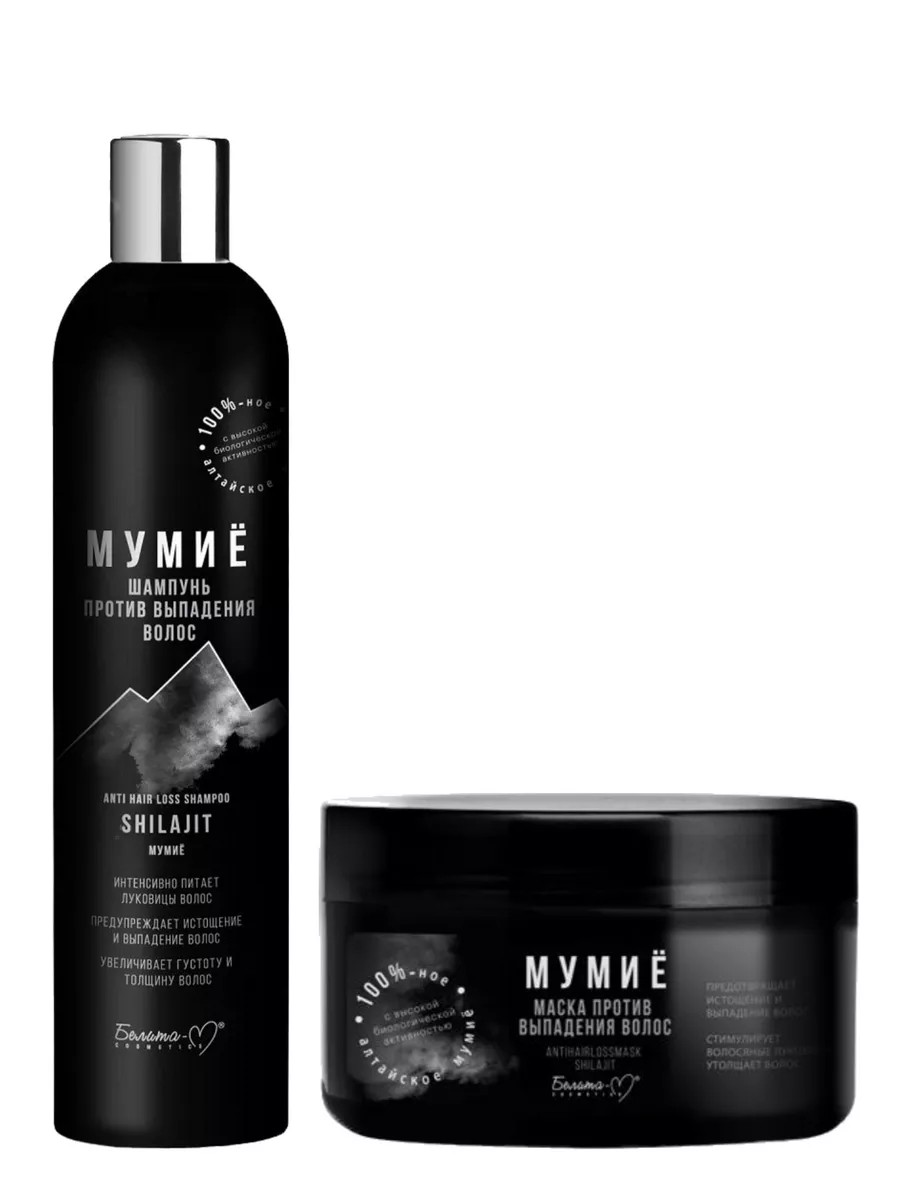 Belita-M Shilajit Hair Care Set: Anti-Hair Loss Shampoo and Anti-Hair Loss Mask. Shilajit Shampoo, a "gift of the mountains," is a valuable natural substance with high biological activity. Purified shilajit contains 80% beneficial bioactive components: bioflavonoids, phospholipids, essential oils, resins, enzymes, chlorophyll, amino acids and fatty acids, vitamins B1, B2, B3, B6, B12, C, E, carotenoids, and minerals: calcium, magnesium, potassium, and zinc. The shampoo strengthens and restores hair structure, stimulates root nutrition, promotes the awakening of dormant hair follicles, and helps grow new, stronger hair from inactive hair follicles. Recommended for preventing hair loss, as well as restoring healthy scalp microflora, for the growth of thicker, fuller hair. How to use: Apply to damp hair, lather with massaging movements, leave on for 2-3 minutes, then rinse thoroughly with warm water. This shampoo is suitable for daily use. The best effect is achieved when used in combination with the Mumiyo anti-hair loss serum and anti-hair loss mask. The anti-hair loss mask completes the intensive care procedure aimed at combating hair loss. It enhances the strengthening and stimulating effect of the Mumiyo serum and shampoo, and also prevents dryness of the hair and scalp, nourishes, softens, and adds shine to the hair. Suitable for daily use, for all hair types. The recommended course is at least three times a week for three months. Suitable for all hair types. Caution: A small amount of natural sediment may fall out. Shake before use. With regular use, a slight caramel tint may appear on very light hair.