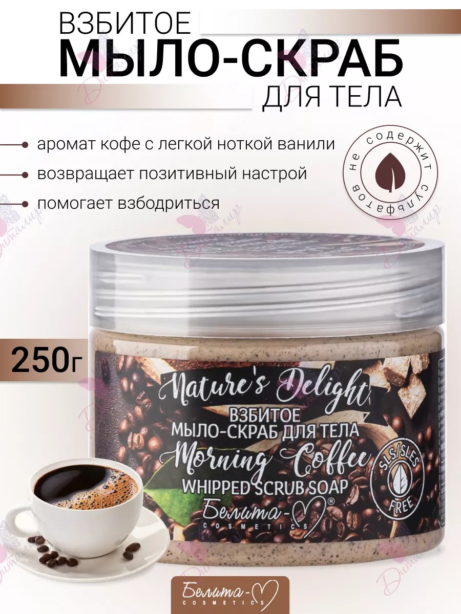 Взбитое мыло-скраб для тела morning coffee nature's delight. Погрузитесь в умиротворяющую атмосферу SPA-отдыха, почувствуйте воздушную легкость и восхитительную свежесть нежнейшего мыла-скраба, созданного на основе мягкого растительного ПАВ, который при контакте с водой образует множество воздушных пузырьков, тщательно очищающих кожу от загрязнений. Отшелушивание позволяет освежить поверхность кожи, к тому же заметно усиливает действие активных веществ из последующих косметических средств. Невероятно аппетитный аромат кофе с легкой ноткой ванили помогает взбодриться и вернуть позитивный настрой. Действие: обеспечивает микромассаж, отшелушивает и шлифует кожу, активизирует клеточный метаболизм, ускоряя процессы обновления и помогая в борьбе с «апельсиновой коркой», делает кожу бархатистой и невероятно нежной, питает ее и увлажняет, устраняя сухость. Способ применения: нанесите мыло-скраб на влажную кожу, очистите тело массирующими движениями. Смойте теплой водой.