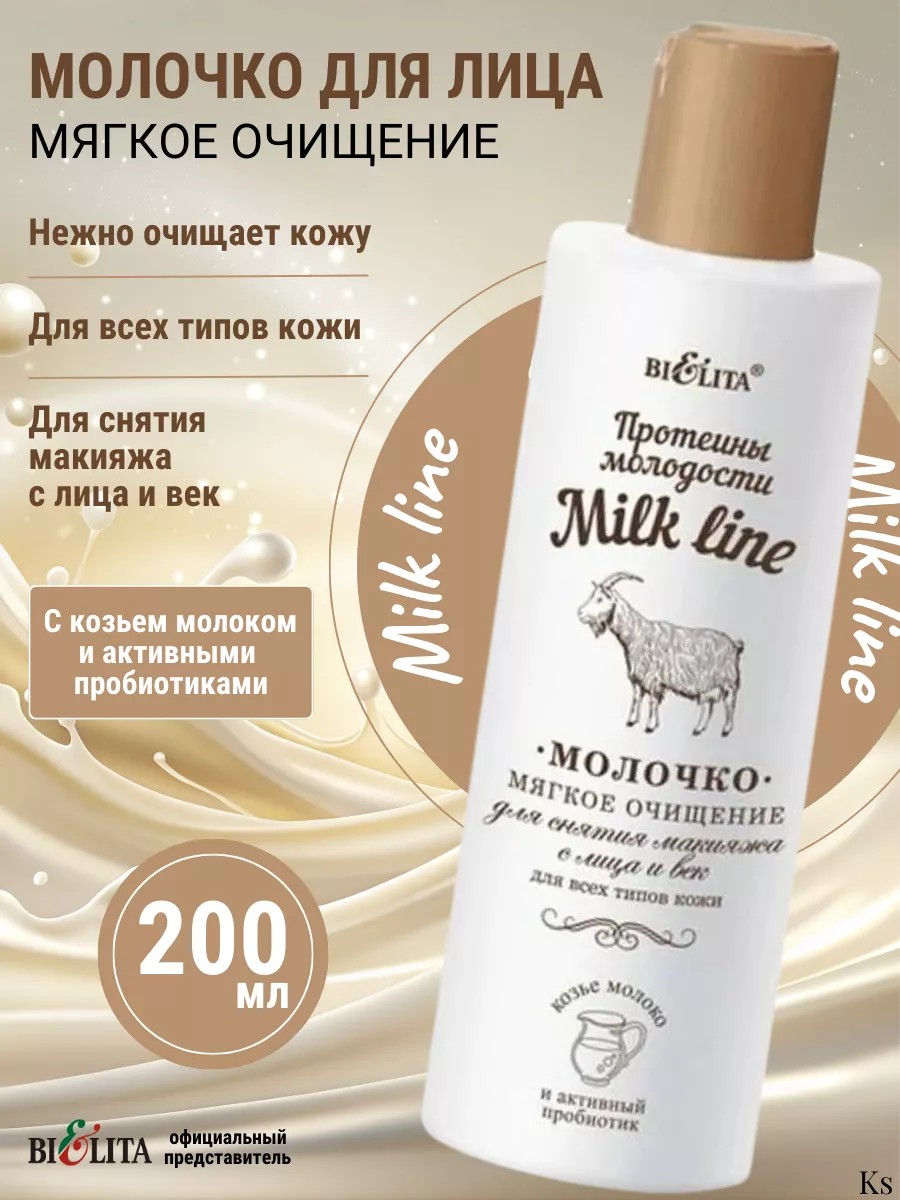 Молочко для снятия макияжа серии Milk Line Протеины молодости от белорусского бренда уходовой и декоративной косметики Bielita с нежной роскошной текстурой мягко и деликатно очищает кожу лица и область вокруг глаз, превосходно удаляет макияж, не оставляя чувства стянутости. Протеины козьего молока в комплексе с активным пробиотиком омолаживают, увлажняют и смягчают кожу, делая ее нежной и шелковистой. Комплекс витаминов A,C,E,F ускоряет процесс обновления клеток, стимулирует синтез коллагена и сокращает морщины. Масло кокоса мгновенно восстанавливает и питает кожу, придает ей упругость и эластичность. Применение: нанесите молочко на ватный диск, очистите кожу лица и век. Козье молоко является великолепным косметическим средством, свойства которого были известны еще в древности. Его называли эликсиром жизни и красоты. Долгие годы сохранявшая красоту царица Клеопатра всегда добавляла в ванну козье молоко, после которого кожа становилась нежной и бархатистой, обретала упругость и красоту. Белорусская компания БЕЛИТА разработала линию косметических средств на основе протеинов козьего молока. В основу линии Milk Line - Протеины молодости входят также активный пробиотик, Toniskin и комплекс витаминов A,C,E,F. Протеины козьего молока, обогащенные витаминами, минералами и питательными веществами, омолаживают, питают и смягчают кожу, делая ее нежной и шелковистой. Активный пробиотик, полученный из лактобактерий, улучшает сопротивляемость кожного барьера, восстанавливает и сохраняет естественный баланс микрофлоры кожи, повышает ее иммунитет. TONISKIN стимулирует синтез коллагена, разглаживает морщины и выравнивает цвет лица. Дарит уставшей коже свежесть и естественное сияние. Комплекс витаминов обладает высокой антиоксидантной активностью, улучшает клеточную регенерацию, благодаря этому кожа быстрее обновляется и выглядит моложе.