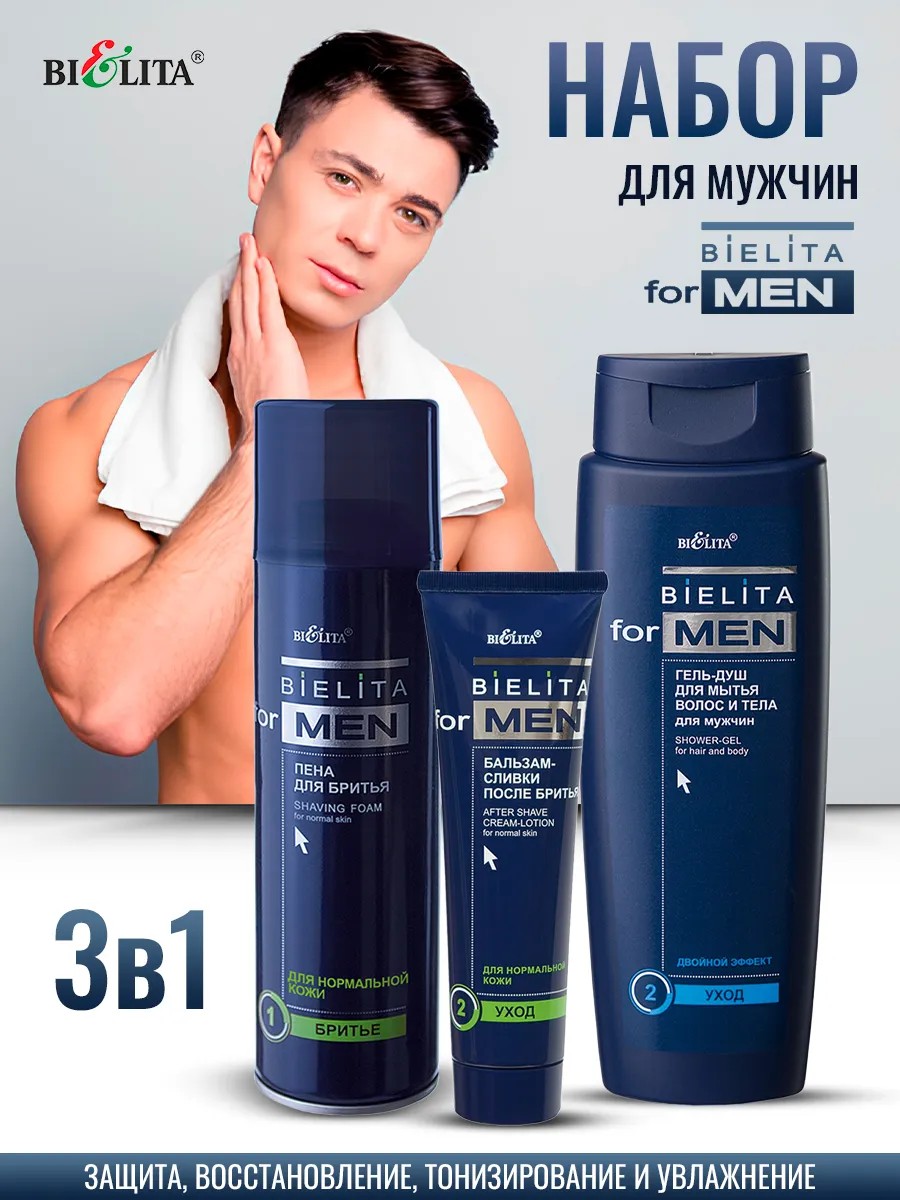 Набор мужской 3 в 1 Bielita for Men. Ежедневный мужской набор для ухода за кожей лица, телом и волосами. В него входит: Гель-душ для мытья волос и тела. Объединяет шампунь и гель для душа в одном флаконе. Образует густую ароматную пену, которая прекрасно моет, ухаживает и заряжает бодростью. Не нарушает естественный баланс кожи и волос, что позволяет использовать гель-душ несколько раз в день. Пена для бритья обеспечивает гладкое скольжение бритвы, защищает кожу уже в процессе бритья. Содержит натуральные противовоспалительные, увлажняющие и охлаждающие компоненты. Бальзам-сливки после бритья мгновенно впитываются, не оставляя ощущения жирности. Увлажняет, успокаивает и смягчает раздраженную кожу, снимает ощущение стянутости. Легкий, нежирный бальзам для ухода за кожей после бритья. Все средства линии имеют приятный модный запах, наполненный природной свежестью, которая заряжает энергией и бодростью.