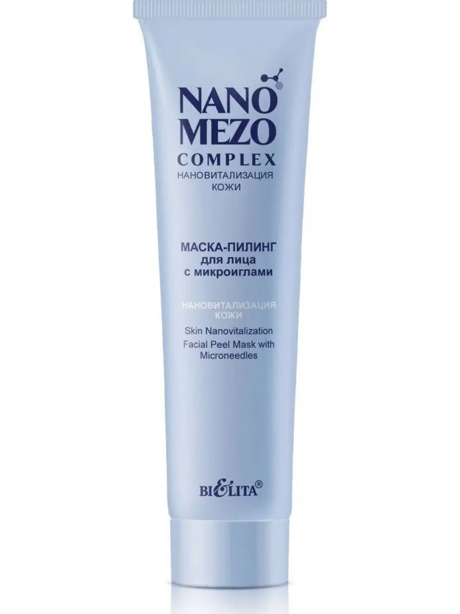NANOMEZOCOMPLEX Facial Peeling Mask with Microneedles Skin Nanovitalization Tube 100ml. The complex of active ingredients - Spicule Gel, X-pressin, Easyliance, Konjac Mannan, LPD Multivitamins, Hyaluronic Acid - provides: skin exfoliation, visible instant lifting effect, reduces wrinkle depth, makes skin smooth and elastic. An alternative to crystal dermabrasion, it renews and revitalizes the skin. Apply a thin layer to cleansed skin for 10-15 minutes, avoiding the eye area. Rinse with water.