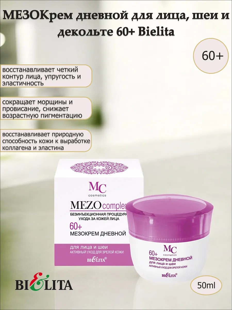 | Полное наименование товара | МезоКрем дневной для лица и шеи 60+ Активный уход для зрелой кожи 50мл. Линия MEZOcomplex 60+. Belita |
