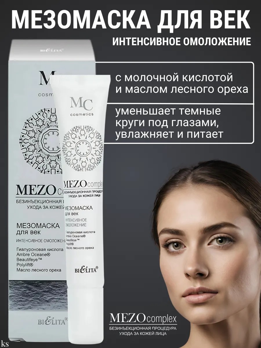 Мезо маска для век Интенсивное омоложение оказывает полноценный уход за нежной кожей вокруг глаз: разглаживает морщины, оказывает подтягивающее действие, снимает напряжение и стирает признаки усталости, уменьшает припухлости и темные круги под глазами, глубоко увлажняет и питает.