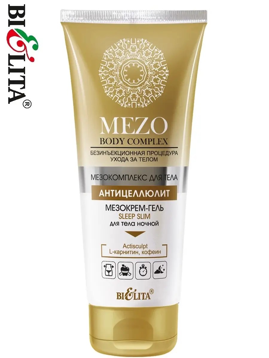 MEZOBodyComplex Belita Sleep Slim Night Body Cream-Gel. An intelligent cosmetic product, specially designed for body shaping, taking into account the biorhythms of fat cells at night. This product contains active ingredients with anti-cellulite, lipolytic, and lymphatic drainage effects, stimulating metabolic processes in tissues by actively affecting fat cells, promoting weight loss and body shaping while you sleep. Actisculpt promotes the intensive breakdown of localized fat deposits, evens out the skin, and improves its elasticity. L-carnitine and caffeine stimulate blood circulation and enhance lipolysis, promoting fat burning. Fucus extract promotes the elimination of excess fluid from the body, providing an anti-cellulite effect. Centella asiatica extract stimulates collagen synthesis, improves skin tone, and makes it firm and smooth. Coconut oil nourishes the skin, softens and soothes it, leaving it smooth and velvety.