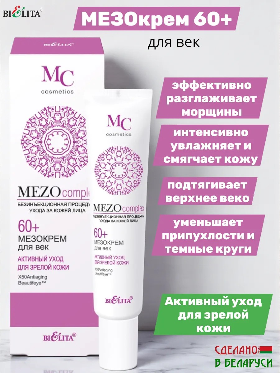 Мезокрем для век 60+ Активный уход для зрелой кожи MEZOcomplex БелитаМезокрем для век разработан с учетом особенностей возрастной кожи.Имеет направленное действие:-ПОДТЯГИВАЕТ ВЕРХНЕЕ ВЕКО-СОКРАЩАЕТ МОРЩИНЫ «ГУСИНЫЕ ЛАПКИ»-УМЕНЬШАЕТ ПРИПУХЛОСТИ И ТЕМНЫЕ КРУГИBeautifeye подтягивает кожу век, разглаживает морщины вокруг глаз, уменьшает припухлости и темные круги под глазами.Гиалуроновая кислота направленного действия проникает в глубокие слои эпидермиса, обеспечивает видимый эффект разглаживания морщин путем выталкивания их изнутри, оказывая действие подобное салонной процедуре мезотерапии.X50Antiaging – «умный» пептид, точно определяющий возрастные изменения кожи – стимулирует клетки кожи к обновлению и омоложению, эффективно разглаживает морщины, увеличивает синтез коллагена и эластина.Кофеин стимулирует микроциркуляцию кожи, уменьшает отечность вокруг глаз.Масло косточек персика интенсивно увлажняет и смягчает кожу, восстанавливает ее защитные функции.
