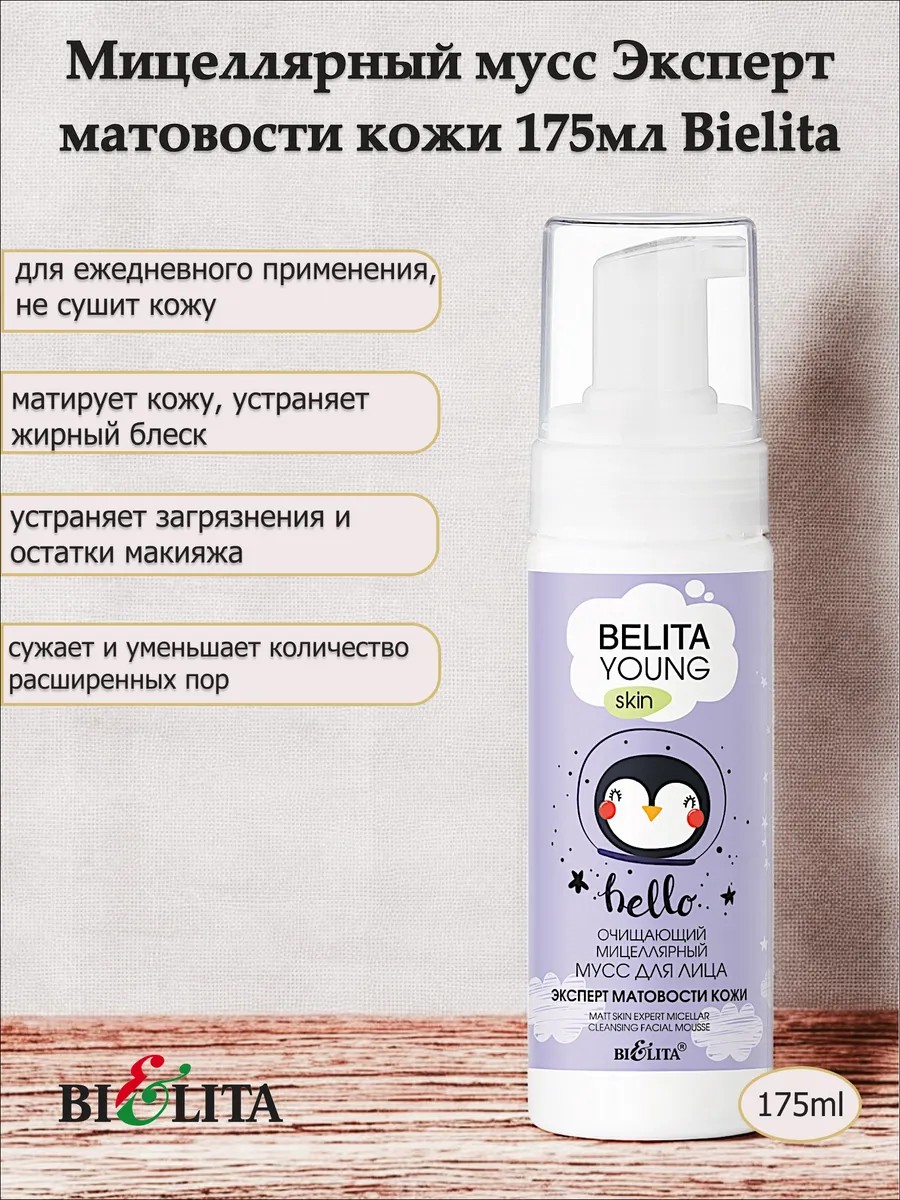 | Комплектация | Очищающий мицеллярный мусс для лица Эксперт матовости 175мл. Линия Belita Young Skin - 1шт. |