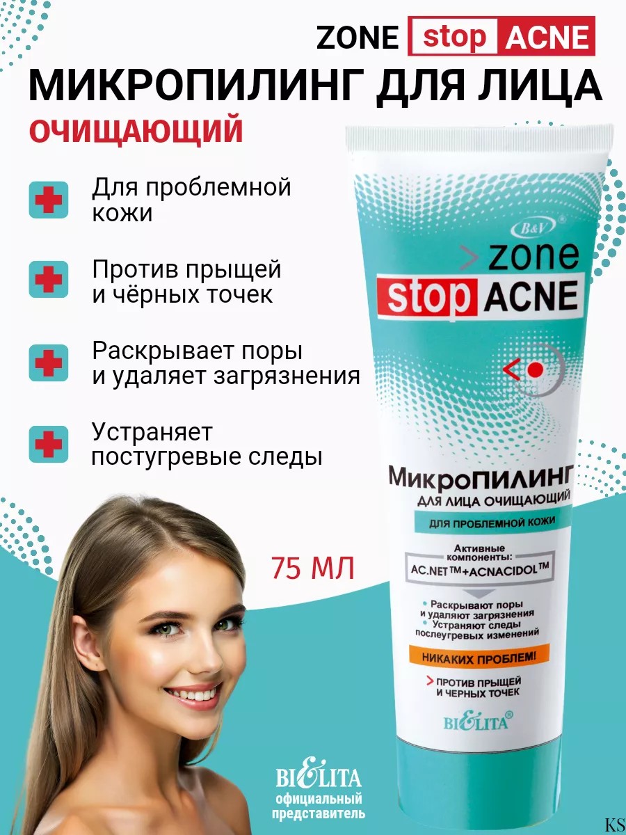 A cleansing micro-peel for the face against acne and blackheads from the Belarusian cosmetics brand Belita, Zone Stop Acne series. Effectively removes oil and impurities, promotes active cell renewal. Improves skin texture, restores a healthy appearance.