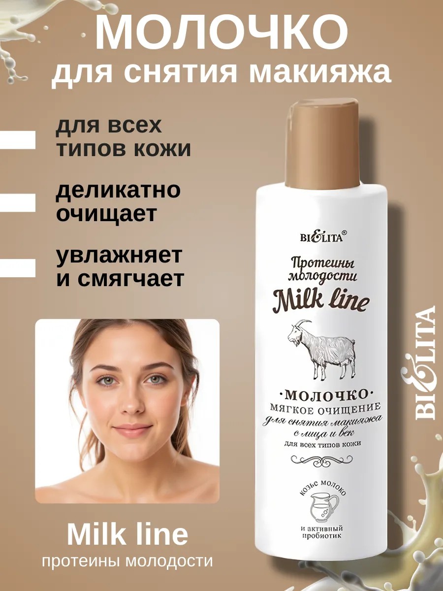 Молочко для снятия макияжа с лица и век мягкое очищение для всех типов кожи Milk Line Протеины молодости. Молочко с нежной роскошной текстурой мягко и деликатно очищает кожу лица и область вокруг глаз, превосходно удаляет макияж, не оставляя чувства стянутости. Протеины козьего молока в комплексе с активным пробиотиком омолаживают, увлажняют и смягчают кожу. Комплекс витаминов A,C,E,F ускоряет процесс обновления клеток, стимулирует синтез коллагена и сокращает морщины. Масло кокоса мгновенно восстанавливает и питает кожу, придает ей упругость и эластичность.