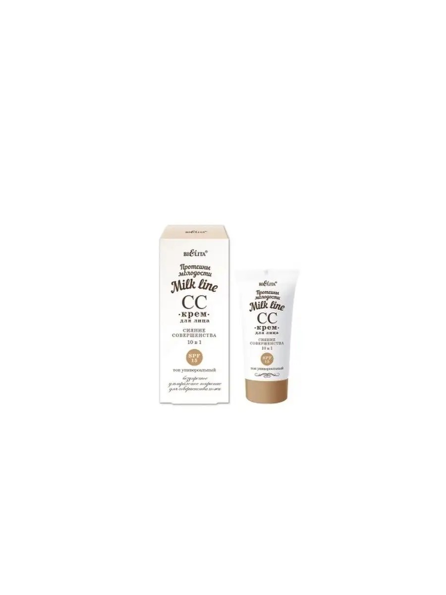 БЕЛИТА MILK LINE СС-Крем для лица Сияние совершенства 10 в 1 SPF 15 Протеины молодости (туба) 30мл, обеспечивает безупречное тональное покрытие и при этом бережно ухаживает за кожей, улучшая ее внешний вид. Легкая формула на основе козьего молока эффективно омолаживает, разглаживает морщины, увлажняет и питает кожу. Оптические частицы мгновенно придают коже здоровый вид, выравнивают тон и обеспечивают естественное сияние. 10 эффектов в 1 креме для совершенства кожи 1. Придает естественное равномерное сияние. 2. Моментально корректирует цветовые несовершенства кожи. 3. Уменьшает видимость морщин и пор. 4. Тонирует и выравнивает цвет кожи. 5. Придает гладкость. 6. Увлажняет в течение дня. 7. Смягчает и разглаживает. 8. Защищает от УФ-излучения (SPF 15). 9. Не оставляет жирного блеска. 10. Идеальная основа под макияж. РЕЗУЛЬТАТ: безупречный ровный тон без несовершенств. Нежная бархатистая кожа излучает естественное сияние в течение всего дня.