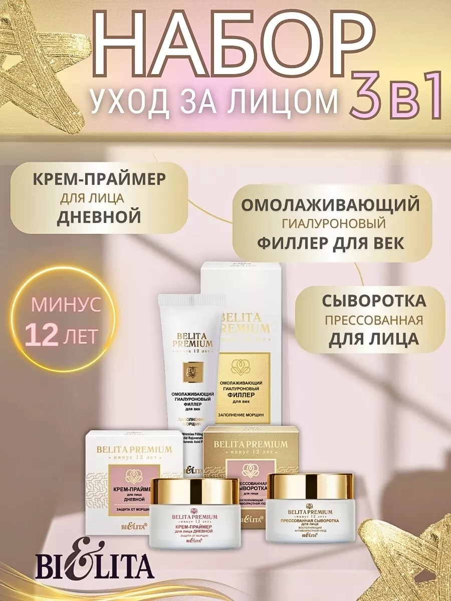 Набор белорусской косметики для ухода за лицом - это полный и эффективный комплект продуктов от Белита - Витекс, разработанных специально для поддержания здоровья и красоты вашей кожи. Он включает в себя: крем-праймер для лица дневной, прессованную сыворотку для лица, омолаживающий гиалуроновый филлер для век.