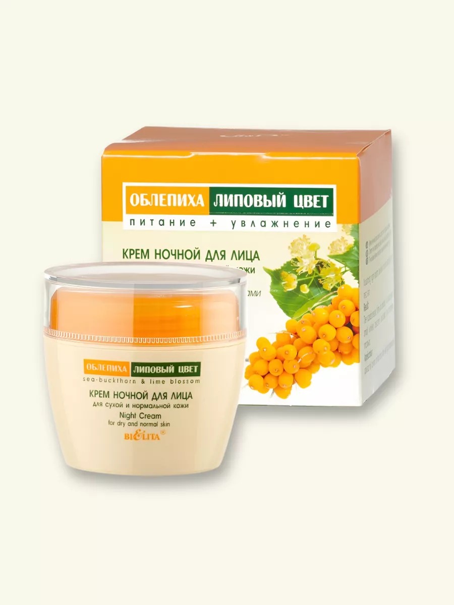Sea Buckthorn Night Cream for Dry and Normal Skin, 50 ml, with sea buckthorn oil, sea buckthorn, and linden blossom extracts. Provides tone and elasticity to tired skin. Renews and moisturizes the skin, providing an antioxidant effect, slowing the aging process. Directions: Apply the cream to clean skin with light movements.