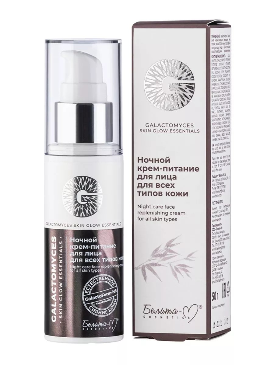 Night nourishing face cream for all skin types from the GALACTOMYCES SKIN GLOW ESSENTIALS line, 50 g. An intensive restorative cream for complete skin care at night. A complex of active ingredients neutralizes the negative effects of fatigue and daytime stress, energizes cells, smoothes the skin and gives it delightful freshness and radiance.
