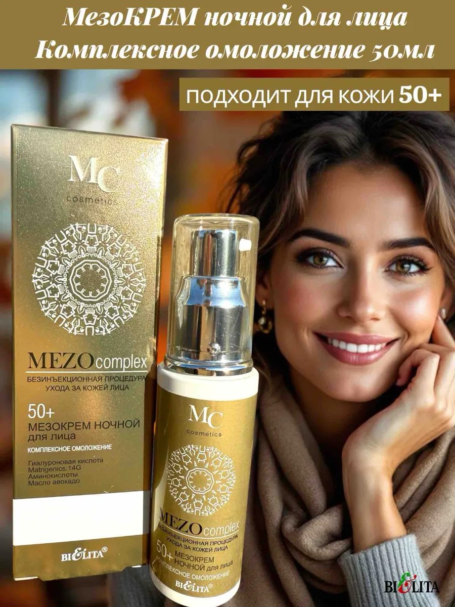 Night mesocream has an active complex effect on the skin of the face during sleep: effectively smoothes wrinkles in the "beauty triangle" area, accelerates cellular renewal and improves skin structure, actively nourishes the skin and restores optimal water balance, enhances the synthesis of collagen, elastin and hyaluronic acid.