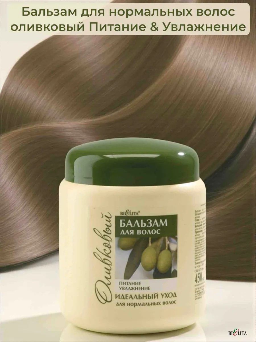 Бальзам Оливковый от Белита для ухода за нормальными волосами. Пиитание&Увлажнение. Насыщает корни питательными веществами, укрепляя волосы. Олива - источник молодости и красоты - питает волосы, восстанавливает их защитную оболочку. Каскадный кондиционер - сохраняет естественную влагу волос, выравнивает поверхность. Бальзам густой , аромат натуральный , хорошо распределяется по волосам, легко смывается . ПРИМЕНЕНИЕ: нанесите бальзам на чистые мокрые волосы, помассируйте , оставьте на 1-2 минуты , промойте водой. Результат - волосы блестят , гладкие , послушные , увлажненные , объемные , сухие кончики заметно преображаются . Бальзам обладает накопительным эффектом , раз за разом волосы действительно становятся всё более и более ухоженными , плотными и крепкими .