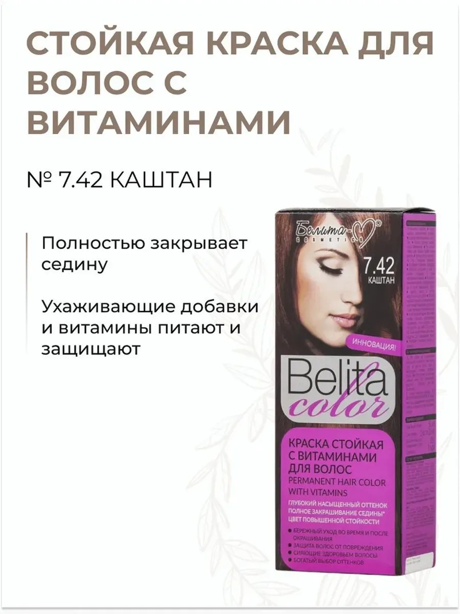| Полное наименование товара | Краска стойкая с витаминами для волос № 7.42 Каштан Belita color |