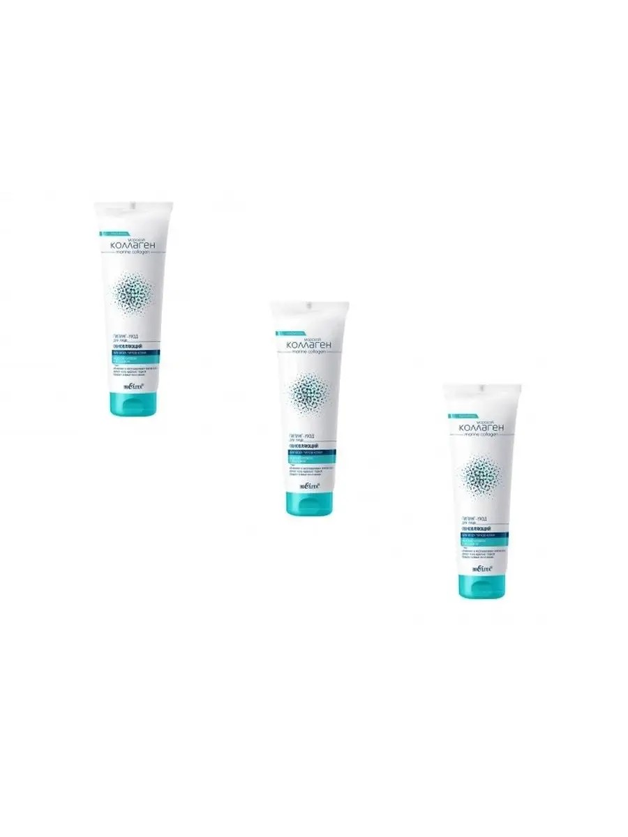 BELITA SEA COLLAGEN Renewing Facial Peeling Treatment 100ml, 3 pcs, Complex of active ingredients: renews and restores skin cells, increases the synthesis of collagen and hyaluronic acid, strengthens the skin and improves its elasticity, makes the skin perfectly smooth, gives it an even tone and radiance. Active ingredients: marine collagen, brown algae, silicon oxide microparticles, cellulose, allantoin and betaine. Brand: Belita Volume: 100 ml Ingredients: water, propylene glycol, silicon dioxide, betaine, poloxamer 184, ammonium acryloyldimethyl taurate/vinylpyrrolidone copolymer, PEG-7 glyceryl cocoate, PEG-40 hydrogenated castor oil, cellulose, panthenyl triacetate, hydroxypropyl cellulose, Sargassum pallidium (seaweed) extract, Laminaria japonica (seaweed) extract, Fucus vesiculosus (seaweed) thallus extract, Laminaria digitata (seaweed) extract, Dead Sea salt, hydrolyzed collagen, phenoxyethanol, methylparaben, ethylparaben, propylparaben, perfume.