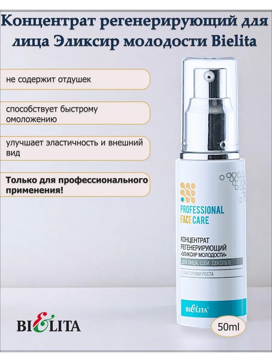 | Полное наименование товара | Концентрат регенерирующий «Эликсир молодости» для лица, шеи и декольте 50мл. Линия Professional Face Care. Belita |