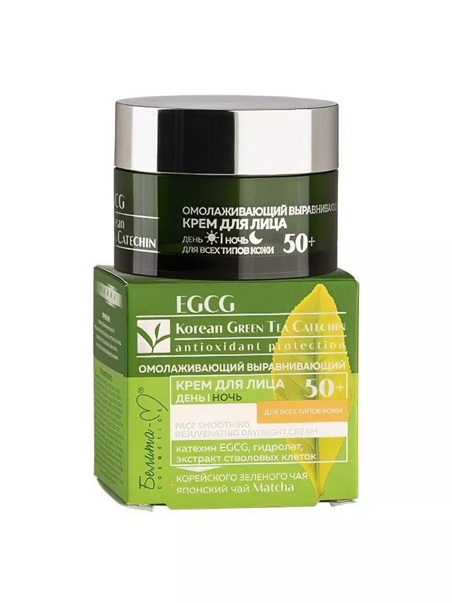 Омолаживающий выравнивающий крем для лица день/ночь для всех типов кожи EGCG KOREAN GREEN TEA CATECHIN 50+ 50 г. Крем специально создан для ежедневного ухода за кожей после 50 лет: сочетание активных ингредиентов в насыщенной формуле крема обеспечивает максимальное увлажнение и разглаживание кожи, возвращает ей плотность, упругость и эластичность. Уменьшает признаки усталости и замедляет процесс старения кожи. Заметно улучшает структуру кожи, осветляет пигментные пятна и выравнивает тон, придает шелковистую гладкость и тонус. Увлажненность и гладкость кож. Ровный тон. Свежий, ухоженный вид. **Действие:** нейтрализует действие свободных радикалов и негативное влияние окружающей среды; защищает кожу от потери влаги и обеспечивает пролонгированный разглаживающий эффект; препятствует увяданию кожи, интенсивно питает и увлажняет; предохраняет кожу от истончения и обезвоживания; защищает от фотостарения; обладает осветляющим эффектом.