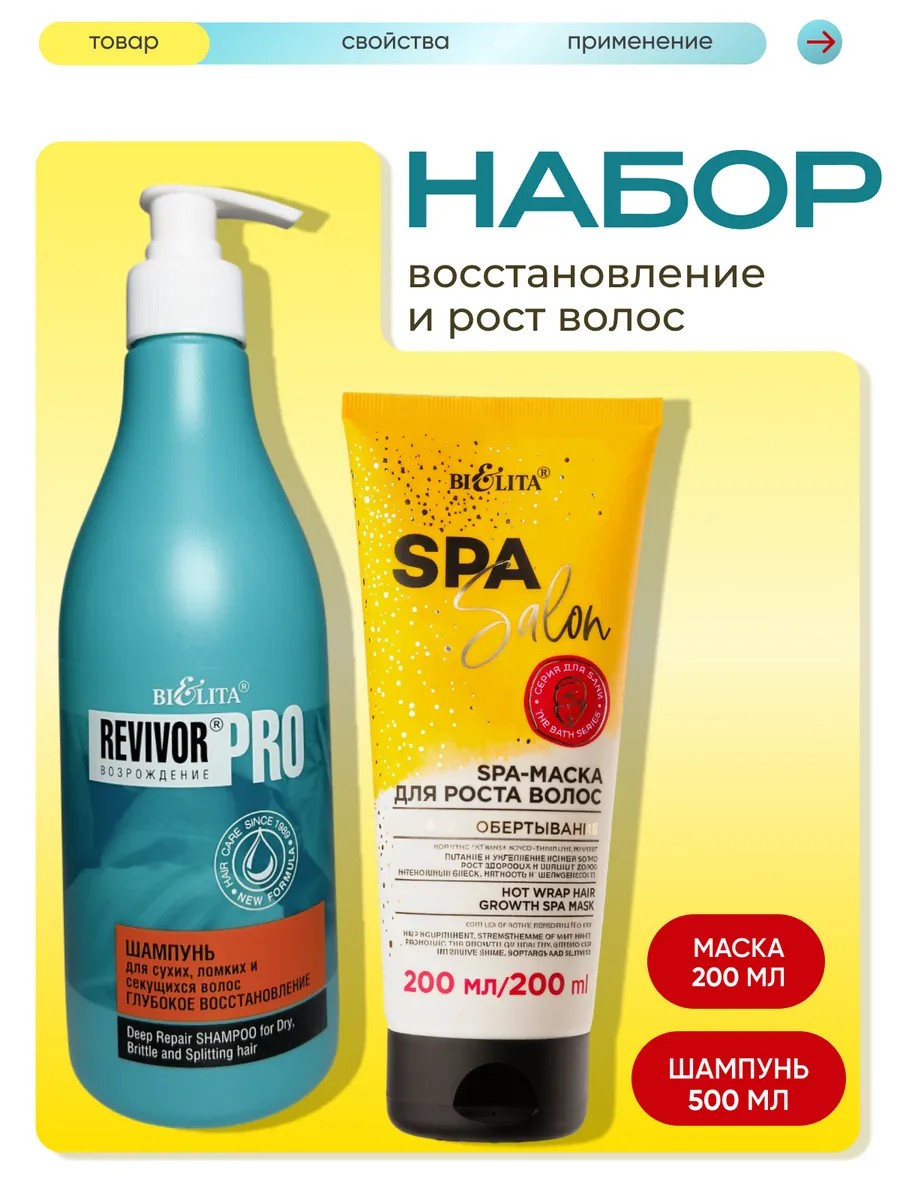 Полное наименование товараВосстанавливающий набор для волос: шампунь revivor Pro+ SPA Salon маска для глубокого увлажнения и ускоренного роста волос