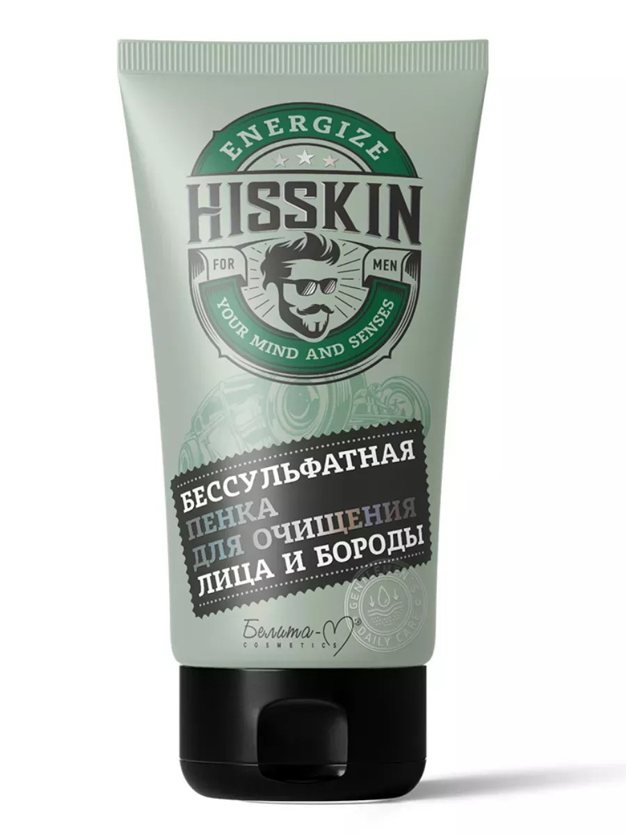 Бессульфатная пенка для очищения лица и бороды HISSKIN 140 г. Эффективное очищение без мыла для ежедневного ухода за кожей любого типа: не сушит и не стягивает кожу, отлично освежает, смягчает щетину, придает бороде и усам мягкость и послушность.