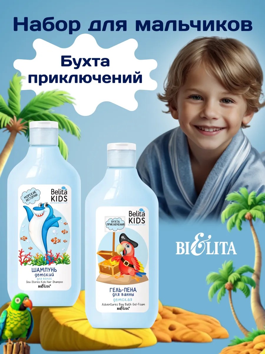 Adventure Bay Boys' Set. Treat your little hero to a fairy tale with Belita KIDS cosmetics for boys aged 3 to 7! Sea Stories Children's Shampoo and Adventure Bay Children's Shower Gel provide wonderful care for your little one's hair and skin! Adventure Bay Bath Gel-Foam by Belita Kids for boys aged 3 to 7 is specially formulated for gentle cleansing and soft skin care. A conditioning additive provides gentle care without drying or irritating the skin. Natural aloe extract moisturizes and nourishes the skin. You can use the foam gel to wash your body, and by dissolving a small amount in water, you can create a fluffy lather, turning bath time into a fun, fruity experience. Belita Kids "Sea Stories" shampoo for boys aged 3-7, with an apricot and mandarin scent, gently cleanses hair and prevents tangling during washing. Natural guar-based conditioner softens hair without weighing it down. Natural chamomile extract moisturizes and strengthens hair. Search queries: gift for a teenage boy for himself, just because, birth of a child, christening, Teacher's Day, Mother's Day, beloved mother, friend, sister, New Year's gift for a child, gift for March 8th, birthday, christening, name day, Valentine's Day, surprise for a boy, friend, girlfriend, teenager, Belarusian cosmetics Belita, Bielita for children, hair detangling spray for a princess, hair gift for children, children's shampoo for girls, children's shampoo and hair conditioner, birthday gift for a child, hair spray, children's shower gel for women, children's shampoo and shower gel from 3 years old for a girl, boy, children's beauty box, gift for a child, cosmetics for baths and showers for a teenager, Chinese unicorn, buy a large cosmetic bag, bag for a girl, natural and safe, children's makeup, makeup brush, fairy princess, makeup artist, children's beauty case box, ROCS hair shampoo, Belarusian cosmetics