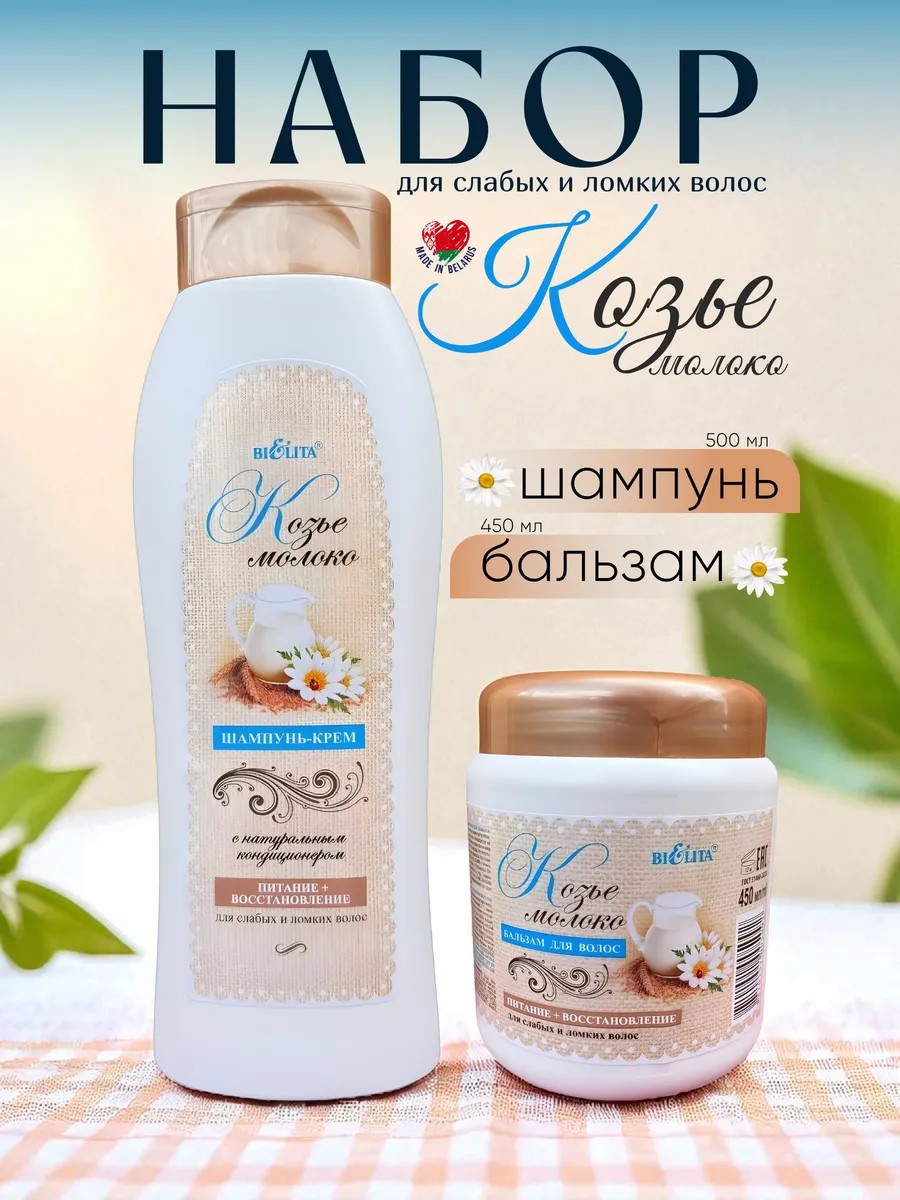 | Package Contents | Set: 500 ml shampoo and 450 ml conditioner "Goat's Milk"; Cream shampoo with natural conditioner "GOAT'S MILK"; Hair conditioner "Goat's Milk"; Belita; for weak and brittle hair; Belarusian cosmetics; Belarusian shampoo and conditioner; shampoo for fine hair; Belarusian shampoo for women; goat's milk shampoo; Belarus shampoo; shampoo for hair restoration |