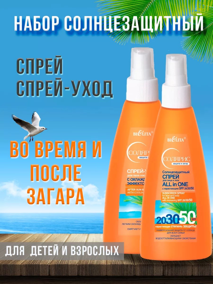 Набор косметических средств Солнцезащитный спрей для лица и тела ALL IN ONE с нарастающим SPF 20/30/50 и Спрей-уход для тела после загара с охлаждающим эффектом от белорусского производителя Белита линия Солярис. Солнцезащитный спрей — уникальное средство с нарастающим фактором защиты. При нанесении его 1 раз SPF будет 20, при повторном нанесении средства — SPF 30, если нанести средство в третий раз, то достигается максимальный SPF 50.