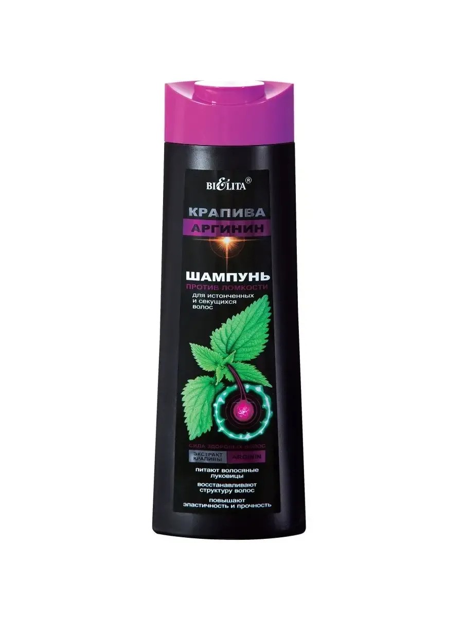 BELITA, Шампунь Крапива&Аргинин против ломкости и секущихся волос 400 мл, 1 шт. Поврежденные, ломкие и ослабленные волосы способны доставить своей обладательнице немало дискомфорта, ведь их так сложно расчесывать и укладывать, они выглядят тусклыми, лишенными объема и жизненной силы. Белорусский производитель Bielita предлагает решение: шампунь против ломкости волос. Это косметическое средство разработано с учетом всех потребностей локонов: оно оказывает восстанавливающее, укрепляющее и защитное воздействие. При регулярном применении шампуня вы заметите, что волосы стали более объемными, эластичными и гладкими. Натуральный экстракт крапивы в составе продукта укрепляет волосяные луковицы, тем самым препятствуя выпадению волос. Сочетание аргинина и молочной кислоты позволяет средству увеличивать прочность и эластичность локонов, наполнять их энергией и восстанавливать по всей структуре. Шампунь против ломкости благоприятно воздействует на кончики волос, запаивая их и предупреждая сечение.