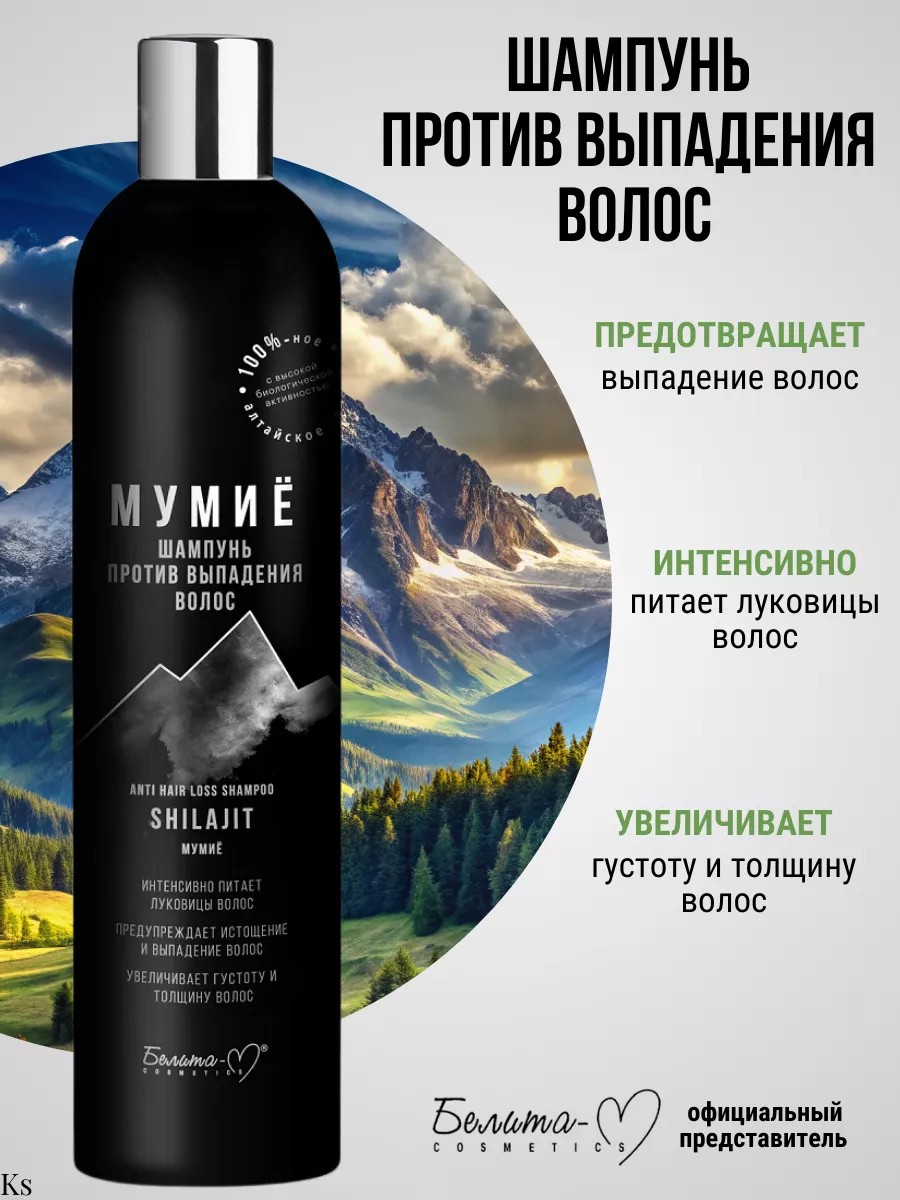 Шампунь против выпадения волос Мумие укрепляет и восстанавливает структуру волос, стимулирует питание корней, способствует пробуждению спящих фолликулов волоса и помогает вырастить из неактивной луковицы новый, более крепкий волос. Мумиё - это ценное природное вещество с высокой биологической активностью. Очищенное мумиё состоит из полезных биоактивных компонентов: биофлавоноиды, фосфолипиды, эфирные масла, смолы, ферменты, хлорофилл, аминокислоты и жирные кислоты, витамины В 1, B2, B3, B6, В12, С, Е, каротиноиды. Минеральные вещества: кальций, магний, калий, цинк.