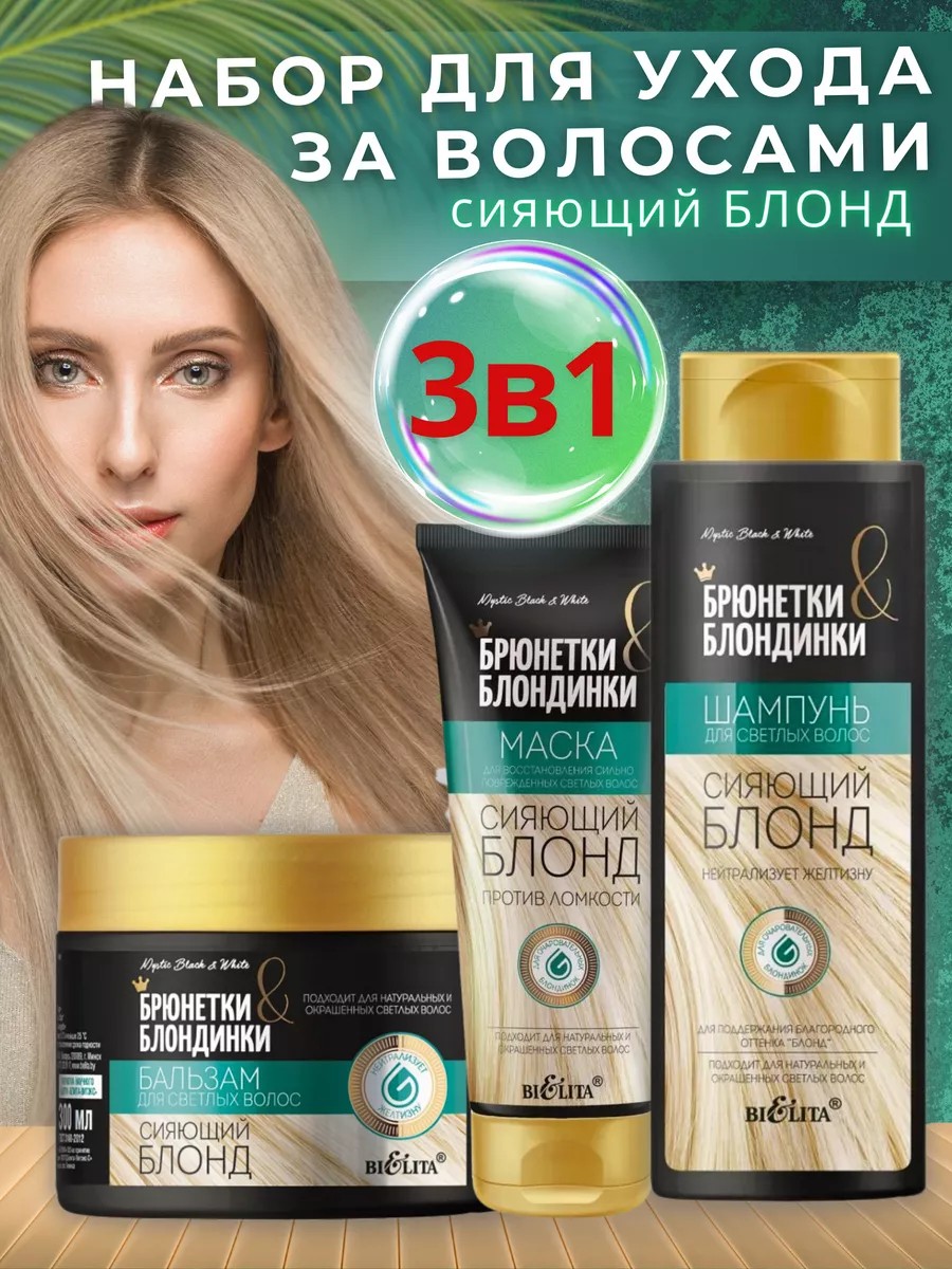 Набор для ухода за волосами «Сияющий блонд» от Belita-Vitex - это ваш ключ к здоровым, блестящим волосам. В комплект входят шампунь, бальзам и маска, которые нейтрализуют желтизну , восстанавливают волосы, придают им сияние и делают их послушными.