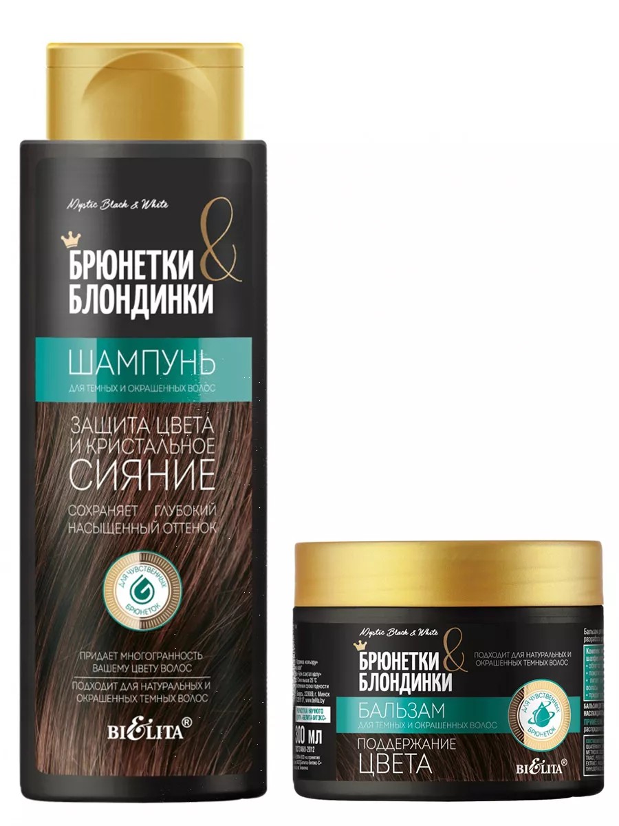 Шампунь для темных и окрашенных волос «Защита цвета и кристальное сияние». Шампунь разработан специально для обладательниц натуральных и окрашенных волос любых темных оттенков. Шампунь деликатно очищает кожу головы и волосы от загрязнений, защищает волосы от тусклости и вымывания оттенка хлорированной водой, сохраняя глубокий насыщенный цвет роскошных темных волос.Бальзам для темных и окрашенных волос «Поддержание цвета» Бальзам «Поддержание цвета» разработан для ухода и сохранения цвета обладательниц натуральных темных и окрашенных волос любых оттенков.