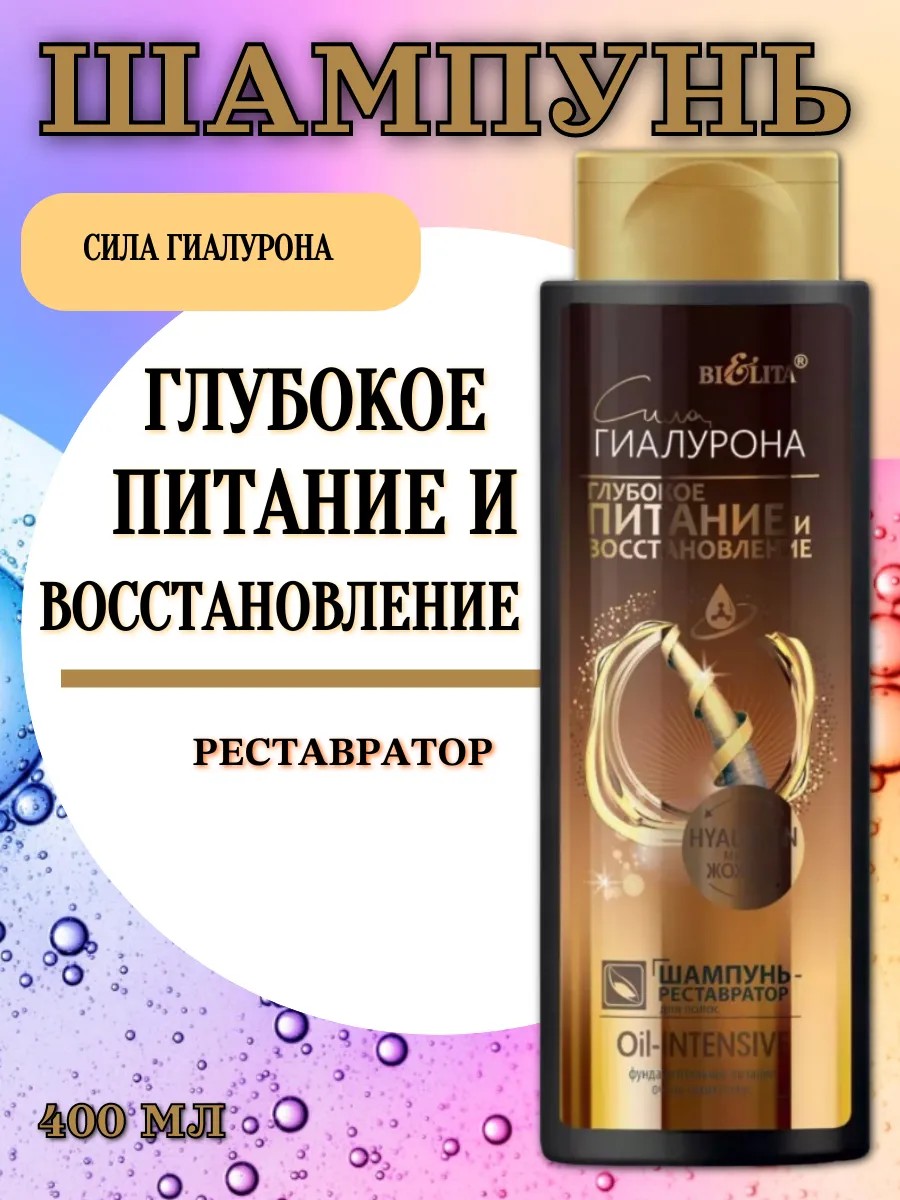 Шампунь-реставратор для волос Oil-Intensive 400 мл. Шампунь-реставратор Сила гиалурона - идеальный продукт для бережного и качественного очищения волос и кожи головы от загрязнений. Он содержит питательные и восстанавливающие свойства, которые подходят для сухих волос. Шампунь содержит комплекс активных компонентов, включающих в себя гиалуроновую кислоту, протеины пшеницы и масло жожоба. Благодаря гиалуроновой кислоте, увлажняющий шампунь питает волосы от корней до самых кончиков.
