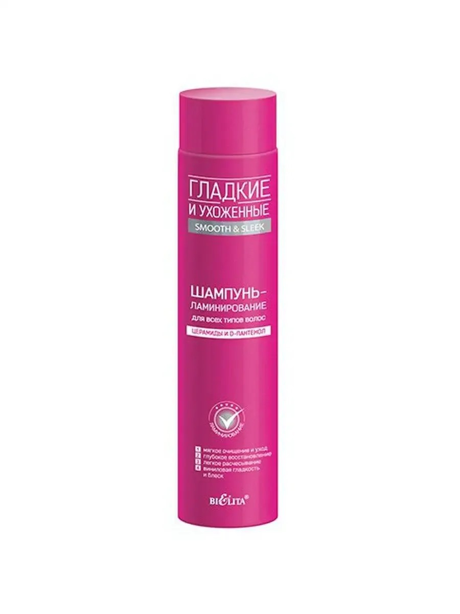 BELITA, Smooth and Well-Groomed Lamination Shampoo for all hair types, 400 ml, 1 pc. This lamination shampoo gently cleanses, moisturizes, and nourishes hair, preventing breakage and split ends. Intensive repair technology instantly transforms damaged, weakened, and brittle hair into sensually smooth and shiny. The formula is enhanced with active ingredients: Ceramides penetrate deep into damaged areas of the hair, filling microcracks and restoring the cuticle layer along the entire length. As a result, hair regains its strength and durability, returning smoothness and shine. D-panthenol thickens hair, prevents breakage and damage, providing long-lasting hydration and nourishment.