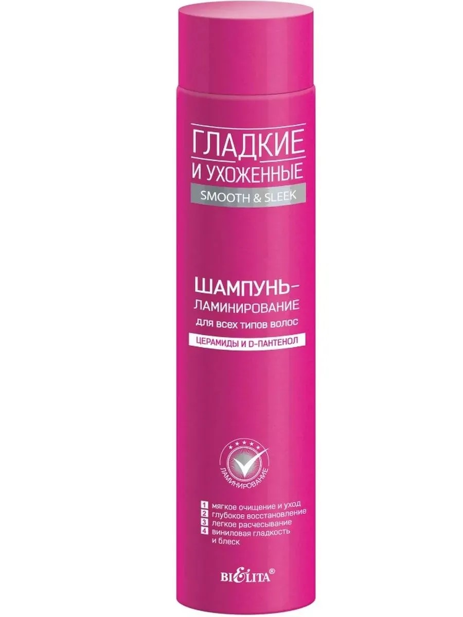 Belita, Шампунь - Ламинирование для всех типов волос, "Гладкие и Ухоженные", 400 мл. Шампунь-ламинирование мягко очищает, увлажняет и питает волосы, предотвращая их ломкость и сечение. Технология интенсивного восстановления мгновенно преобразует поврежденные, ослабленные и ломкие волосы в чувственно-гладкие и блестящие. Формула, усиленная активными компонентами: Церамиды глубоко проникают в поврежденные участки волоса, заполняя микротрещины и восстанавливая кутикулярный слой по всей длине. В результате волосы вновь обретают силу и прочность, возвращается гладкость и блеск. Д-пантенол утолщает волосы, предотвращает их ломкость и повреждение, обеспечивает длительное увлажнение и питание.Составвода 50%, косметическая основа 45%, парфюмерная отдушка 5%.