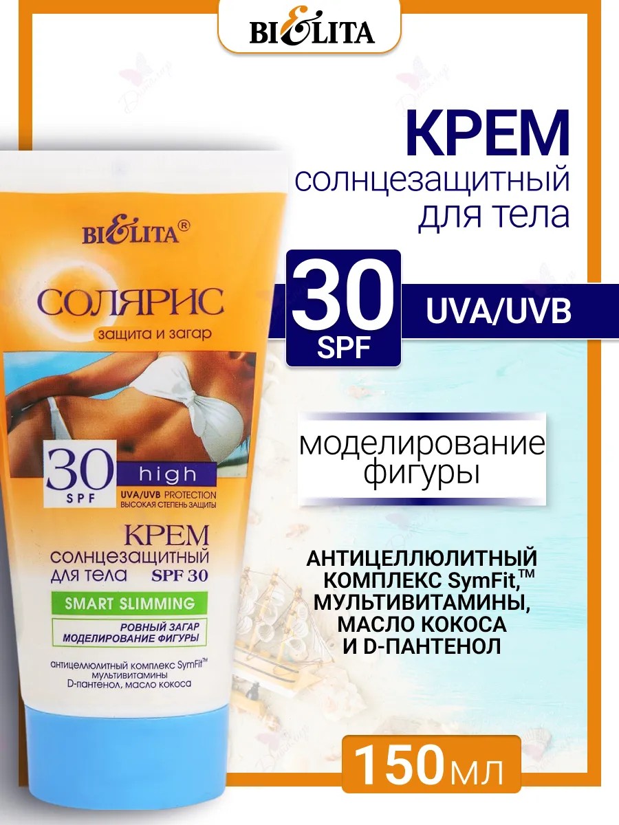 Solaris Sunscreen Cream SPF30 for the body SMART SLIMMING Belita. Multifunctional cream, developed using smart technology, allows you to correct and shape your figure while sunbathing, reduce the appearance of cellulite and strengthen the skin, protect it from harmful sun exposure, and get an even, beautiful tan. The anti-cellulite complex SymFit enhances the breakdown of fats during the process of weight loss; blocks the filling of fat cells with fat; slows the formation of new fat cells. Multivitamins (vitamins A, E, C, F) protect the skin from photodamage, regulate collagen synthesis, provide antioxidant protection and an even tan. Coconut oil nourishes, softens, moisturizes the skin, provides natural protection from harmful sun exposure. D-panthenol is an effective soothing agent for relieving the symptoms of sunburn: burning and redness of the skin.