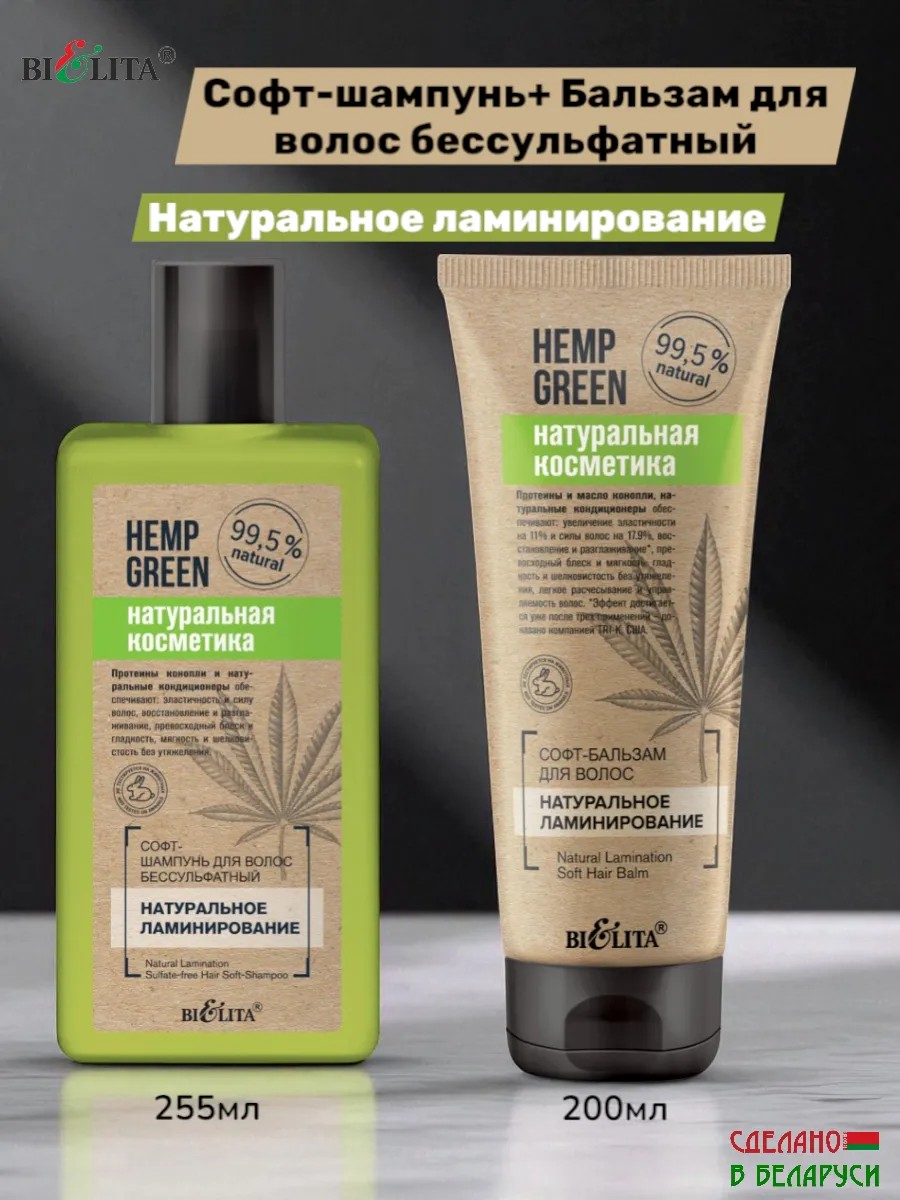 Софт-шампунь для волос безсульфатный «Натуральное ламинирование» Hemp green 255 мл. Протеины и натуральные кондиционеры обеспечивают эластичность и силу волос. Шампунь восстановление и разглаживание, превосходный блеск, гладкость, мягкость и шелковистость без утяжеления. Уход для волос: Нанесите безсульфатный шампунь для волос «Натуральное ламинирование» Hemp green на кожу головы, вспеньте массажными движениями и смойте водой.Софт бальзам для волос Натуральное ламинирование Hemp Green 200 мл. Веганский бальзам для волос из серии органической косметики Hemp Green придаст вашим волосам восхитительный блеск, гладкость и шелковистость без утяжеления. После использования органической маски волосами становится легче управлять и расчесывать. Благодаря натуральным кондиционерам, маслу и протеинам обеспечивается увеличение силы и эластичности волос, их восстановление и разглаживание. Эффект усиливается при использовании с софт-шампунем из этой же серии. Hemp green на 99,5% состоит из натуральных компонентов. В состав продуктов входит масло и протеины, которые активно питают и восстанавливают, обеспечивают полноценный уход за кожей и волосами. Откройте для себя это удивительное растение заново, наслаждаясь этим древним ингредиентом, который чудодейственно влияет на кожу и волосы! Протеины в составе средств по уходу за волосами уже после трех применений: увеличивают силу и эластичность волос, заметно восстанавливают кутикулу волоса и разглаживают их после химического повреждения.