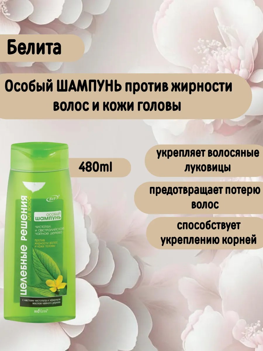 Особый ШАМПУНЬ против жирности волос и кожи головы Чистотел и австралийское чайное дерево эффективно очищает кожу и волосы, склонные к быстрому загрязнению. Обладает приятным естественным ароматом чайного дерева.