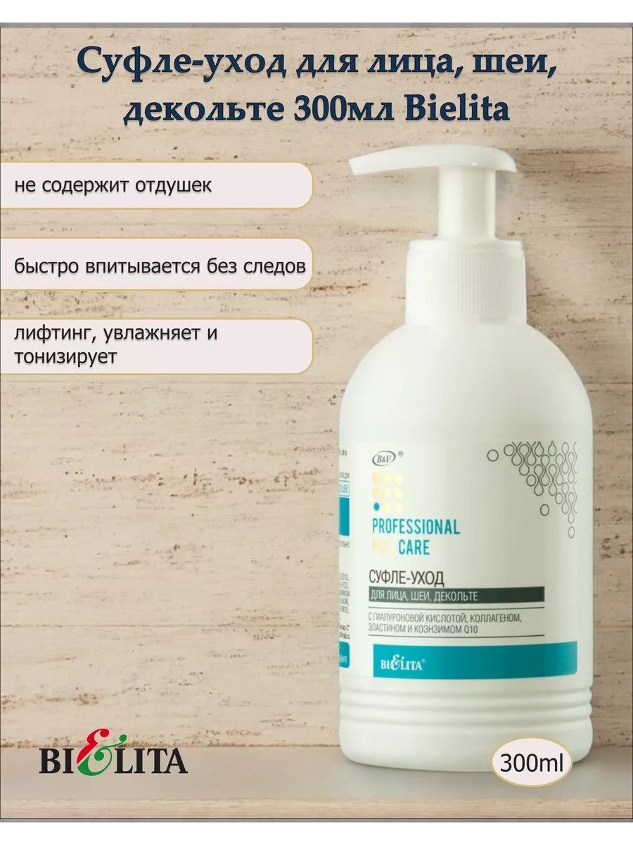 Суфле-уход для лица, шеи, декольте с гиалуроновой кислотой, коллагеном, эластином и коэнзимом Q10 300мл профессиональной линии Professional Face Care Белита.