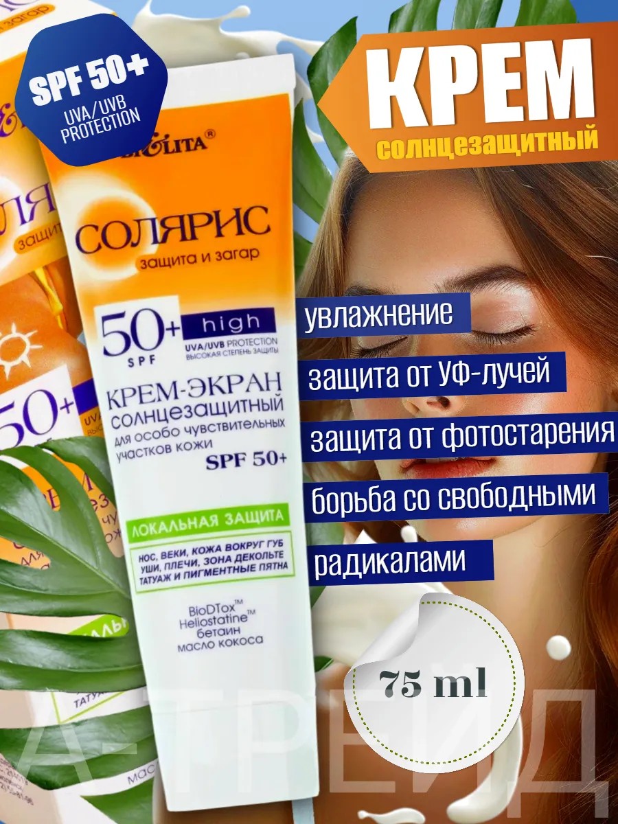 Белорусская солнцезащита - крем-экран для особо чувствительных зон кожи с высоким фактором СПФ 50+ линии Солярис 75 мл. Средство обеспечивает максимальный барьер от воздействия солнца, UVA — и UVB-лучей. Создает эффективную защиту от солнечных лучей, пигментации, предотвращая ожоги на особо нежных и чувствительных поверхностях лица и тела: нос, уши, вокруг глаз и губ, плечи, зоны декольте и бикини, участки с пигментными и родимыми пятнами. Активные компоненты, входящие в состав крема, противостоят свободным радикалам и борются с последствиями их образования, предотвращают фотостарение и появление новых пигментных пятен, позволяя получить коже ровный и безопасный загар.