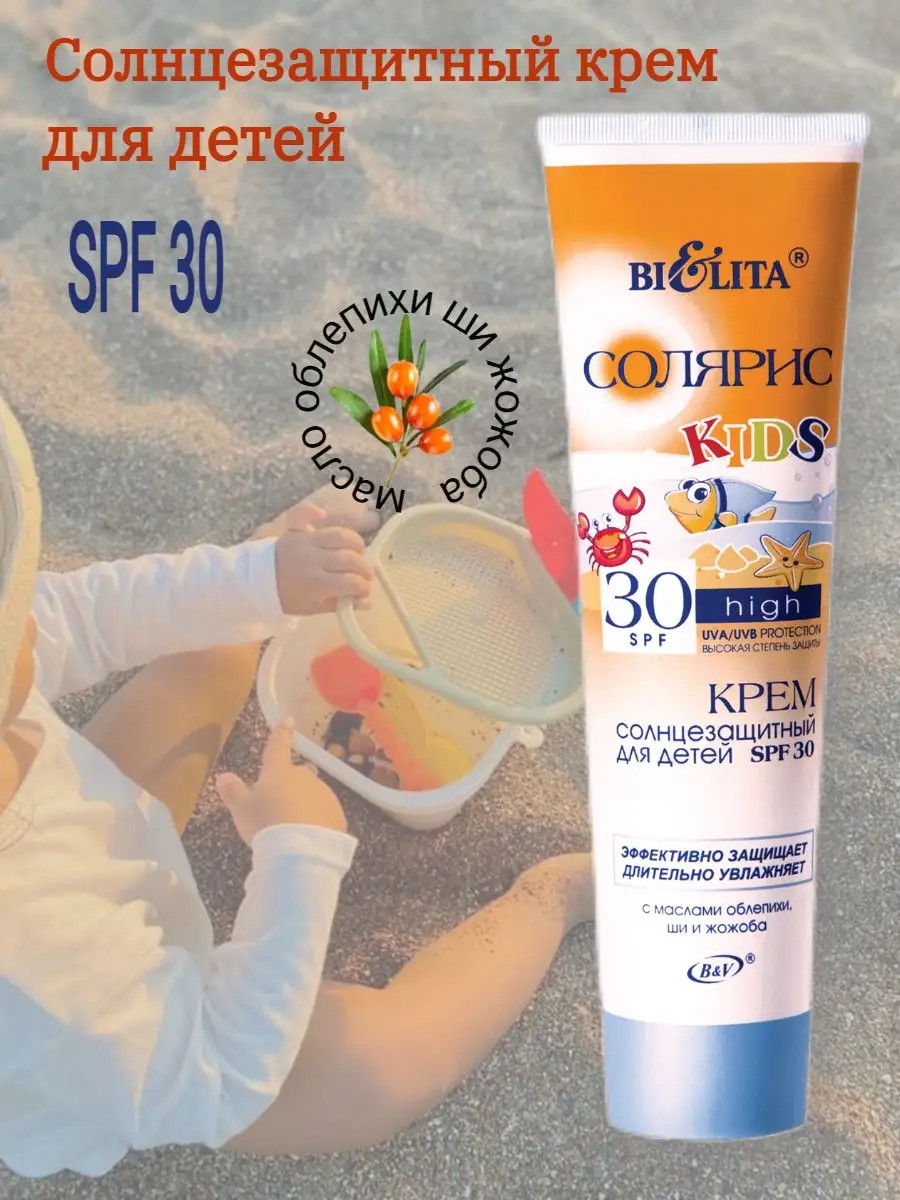 Солярис Крем солнцезащитный SPF30 для детей Belita содержит высокоэффективные (только минеральные) солнцезащитные компоненты, защищающие нежную детскую кожу от ультрафиолетовых лучей. Крем усиливает защитные функции кожи. Активные кмпоненты - алоэ вера, D-понтенол - увлажняют, снимают раздражение, успокаивают кожу. Масла облепихи, ши и жожоба - нейтрализуют вредное воздействие солнечных лучей, питают, смягчают, защищают кожу.
