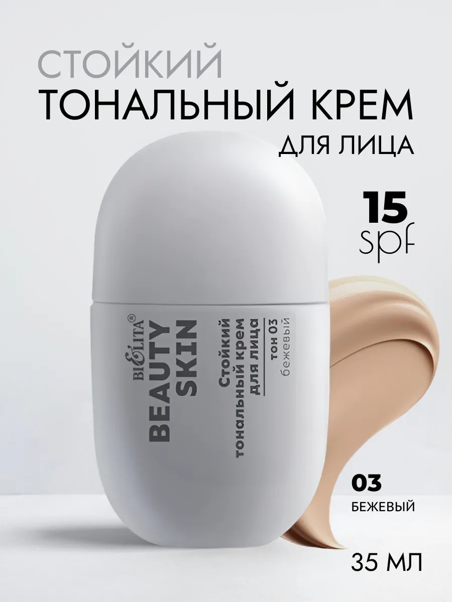 Стойкий тональный крем для лица Beauty Skin тон 01 слоновая кость Идеально подходит для того, чтобы создать образ, который сохранит стойкость до 12 часов. Дает лёгкий устойчивый результат с UV-защитой SPF 15.