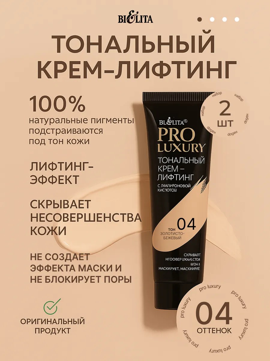 Тональный крем - лифтинг для лица Luxury pro от белорусского производителя декоративной косметики Bielita (Белита) - секрет вашего мгновенного преображения. Тональник сочетает в себе 100% натуральные пигменты, подстраивающиеся под естественный тон кожи, и комплекс активных компонентов, которые необходимы для создания идеальной кожи. Гиалуроновая кислота в составе увлажняет кожу на протяжении всего дня. Комплекс активных компонентов скрывает несовершенства кожи, выравнивая её тон, безупречно маскирует морщинки обеспечивает лифтинг-эффект, не создает эффекта маски и не блокирует поры, не стирается от прикосновений и не оставляет пятен на одежде.
