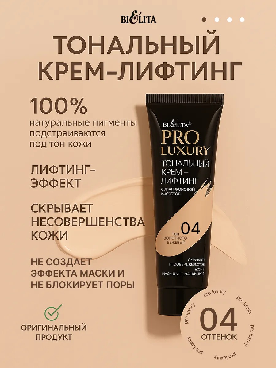 Тональный крем - лифтинг для лица Luxury pro от белорусского производителя декоративной косметики Bielita (Белита) - секрет вашего мгновенного преображения. Тональник сочетает в себе 100% натуральные пигменты, подстраивающиеся под естественный тон кожи, и комплекс активных компонентов, которые необходимы для создания идеальной кожи. Гиалуроновая кислота в составе увлажняет кожу на протяжении всего дня. Комплекс активных компонентов скрывает несовершенства кожи, выравнивая её тон, безупречно маскирует морщинки обеспечивает лифтинг-эффект, не создает эффекта маски и не блокирует поры, не стирается от прикосновений и не оставляет пятен на одежде.