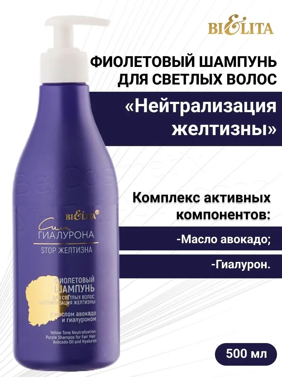 Фиолетовый шампунь для светлых волос "Нейтрализация желтизны" с маслом авокадо и гиалуроном - Предназначен для ухода за светлыми, обесцвеченными и седыми волосами. Комплекс активных компонентов (Масло авокадо, Гиалуроновая кислота): нейтрализует желтизну, эффективно увлажняет, придает волосам эластичность и неповторимое сияние, защищает от вредных воздействий окружающей среды. Назначение: Светлые волосы, Увлажнение, Сияние. Применение: нанесите на влажные волосы, вспеньте, смойте водой.