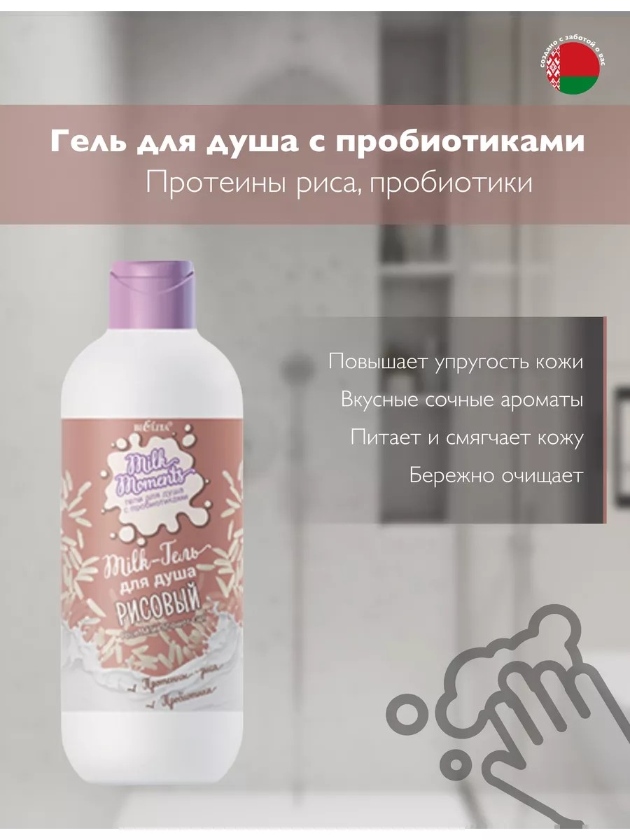 Milk Moments Creamy Shower Gel with rice proteins and active probiotics combines gentle cleansing with rich, nourishing care for the skin of your body, hands, and feet. Rice proteins infuse your skin with vitamins and minerals, imparting amazing softness and silky smoothness. A probiotic complex stimulates the development of beneficial microflora on the skin, strengthening the microbiome. It tones, stimulates cell regeneration, and moisturizes throughout the day. Skin becomes firm, toned, radiant, and silky. This perfumed women's shower gel creates a soft and fragrant lather on your body, moisturizing your skin, imparting an unforgettable fruity scent, and providing long-lasting protection from dryness. The shower gel effectively cleanses and gently caresses every area of your body. This nourishing, anti-stress bathing gel is free of silicones, parabens, and mineral oils. This unisex shower gel is ideal for daily use. This men's shower gel will give you a boost of energy and vitality all day long! This shower gel for the whole family contains only the finest ingredients to keep your skin healthy and soft. Belita-Vitex cream-gel makes a wonderful gift for your family and friends for New Year's, birthdays, March 8th, Christmas, and more. Vitex professional body care cosmetics have no age restrictions and are perfect as gifts for mom, dad, grandparents, grandsons, and all relatives and friends.
